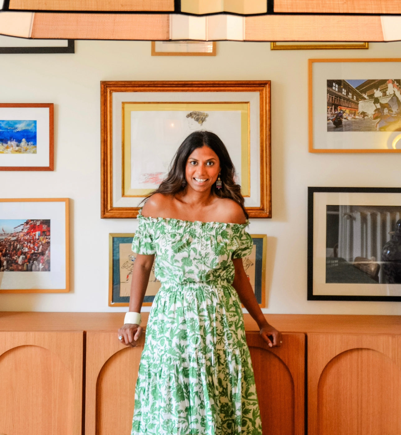 Details: Top- Elastic off shoulder top with short puff sleeves. Midi length skirt ( elastic waist) with pockets - fully lined.