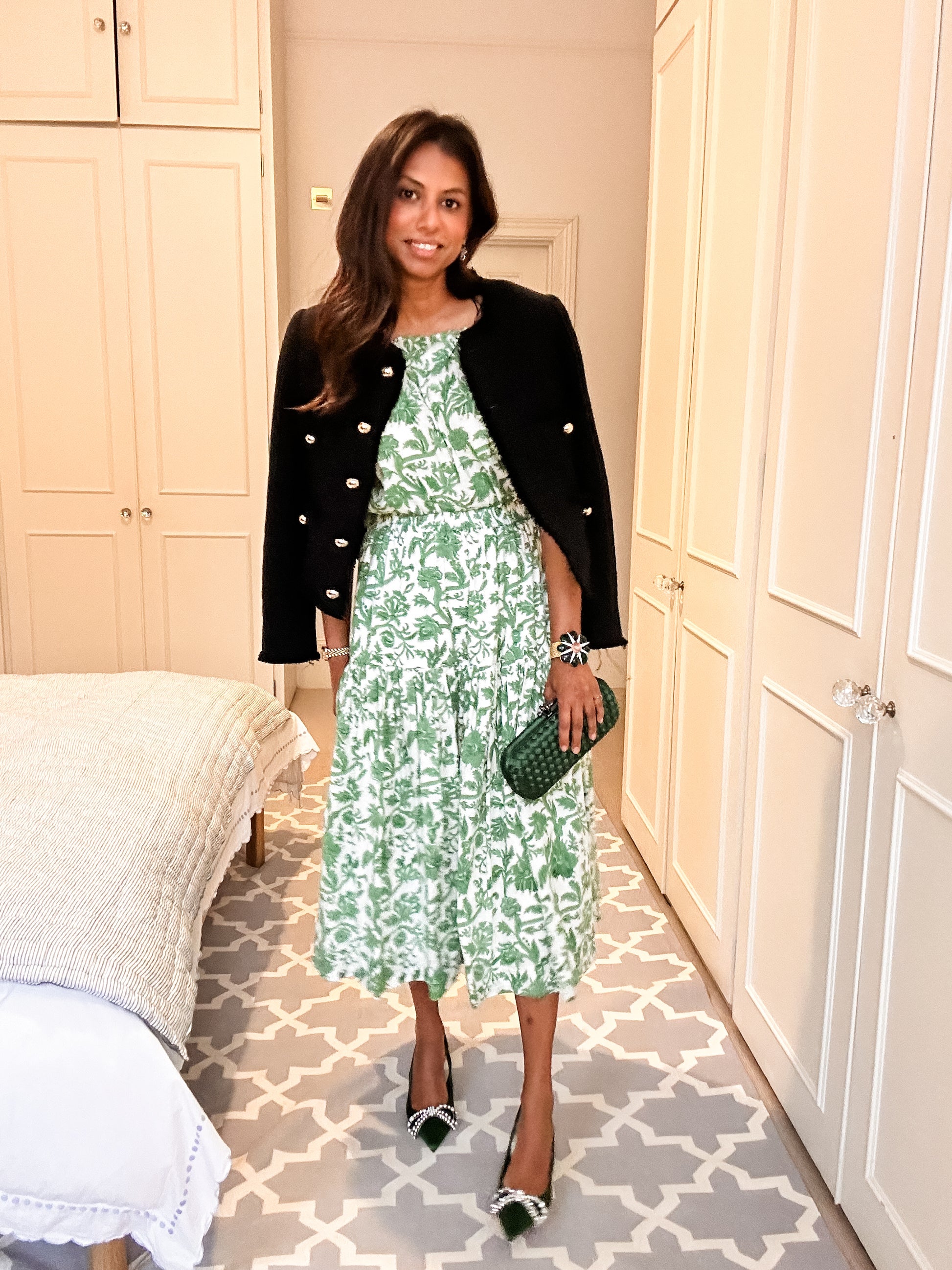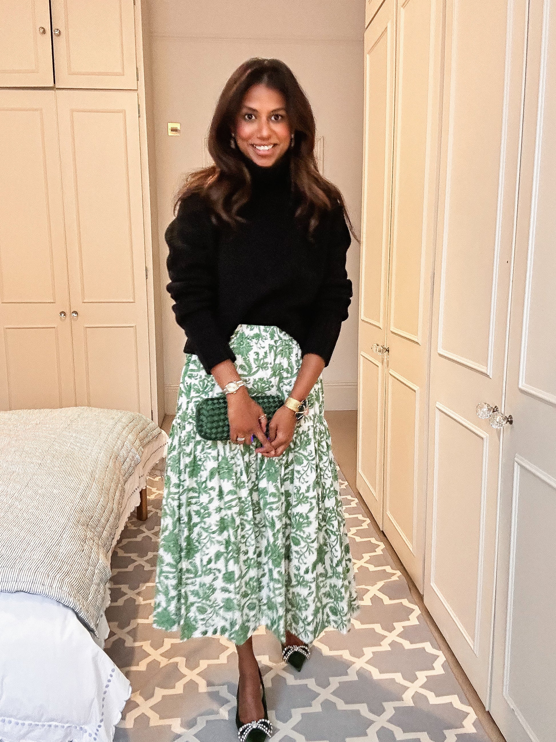 We love a matching set and this elegant emerald green one is no exception. The elasticized off shoulder neckline shows off your shoulders and paired with the elastic waisted midi length skirt makes this a comfortable and stylish go to outfit summer or Holiday Season.
