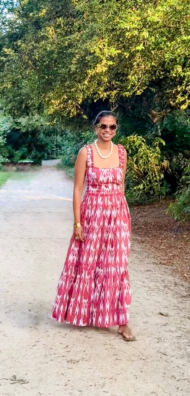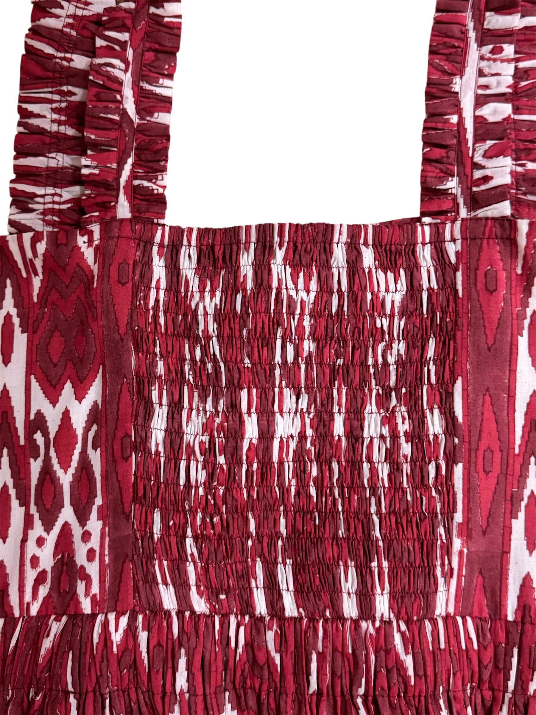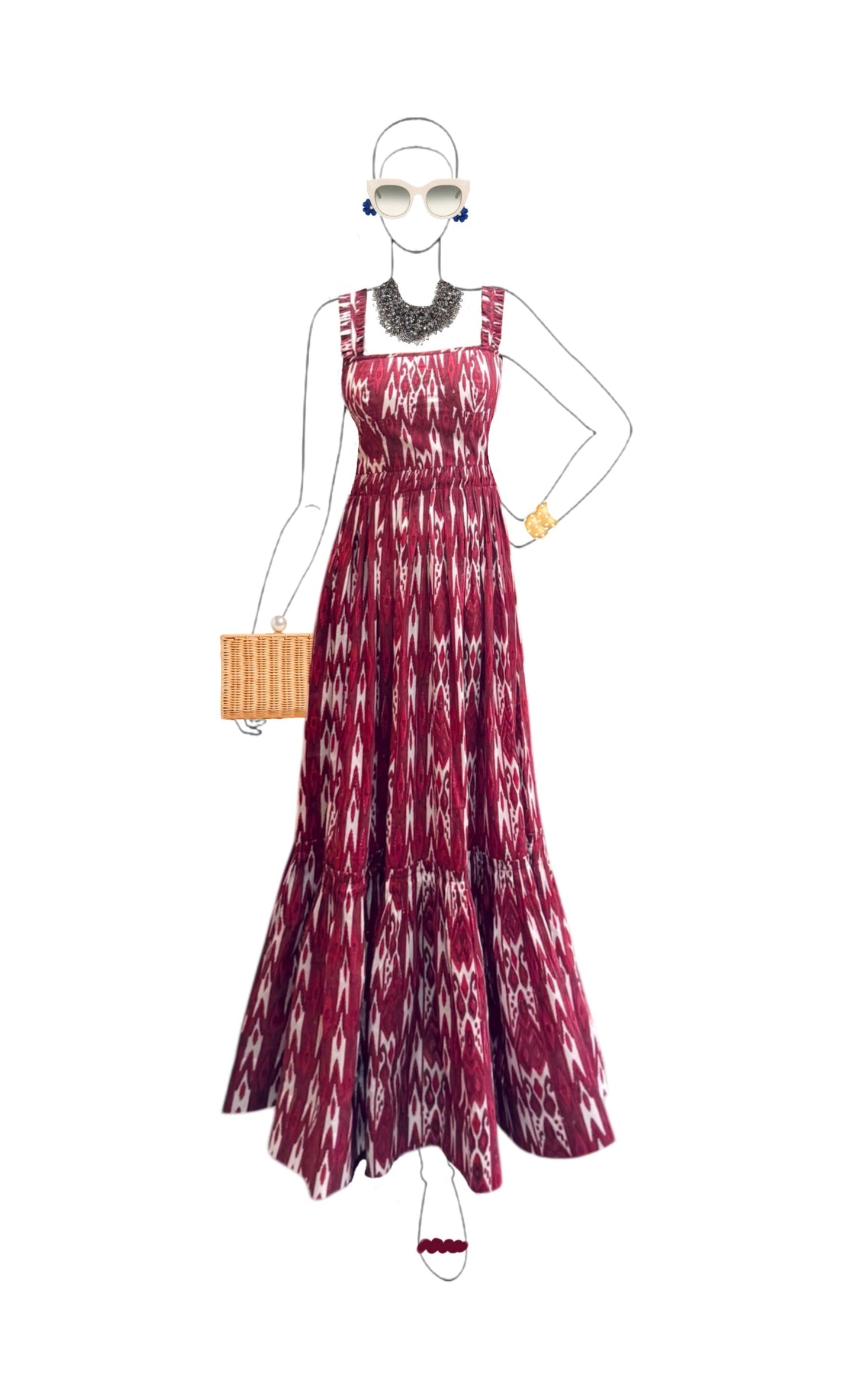 The timeless GEORGINA dress is destined to be a classic for years to come. Its upper body boasts a snug fit, courtesy of the smocking in the back, forming a corset-like silhouette that is remarkably comfortable to wear. The wide square neckline is flattering to all and creates a beautiful frame. Transitioning seamlessly, the top of the dress tapers at our narrow point and then gracefully unfolds into a long, skirted bottom. Pockets are thoughtfully incorporated for both style and practicality.