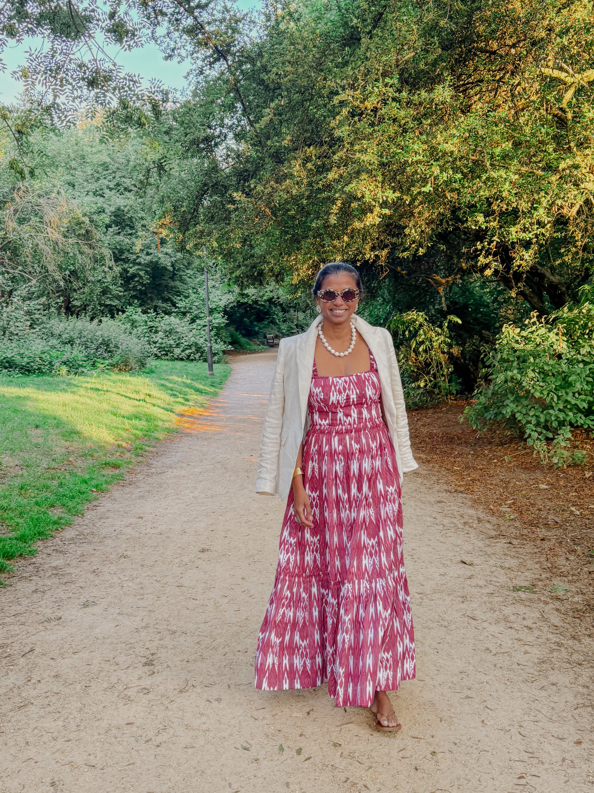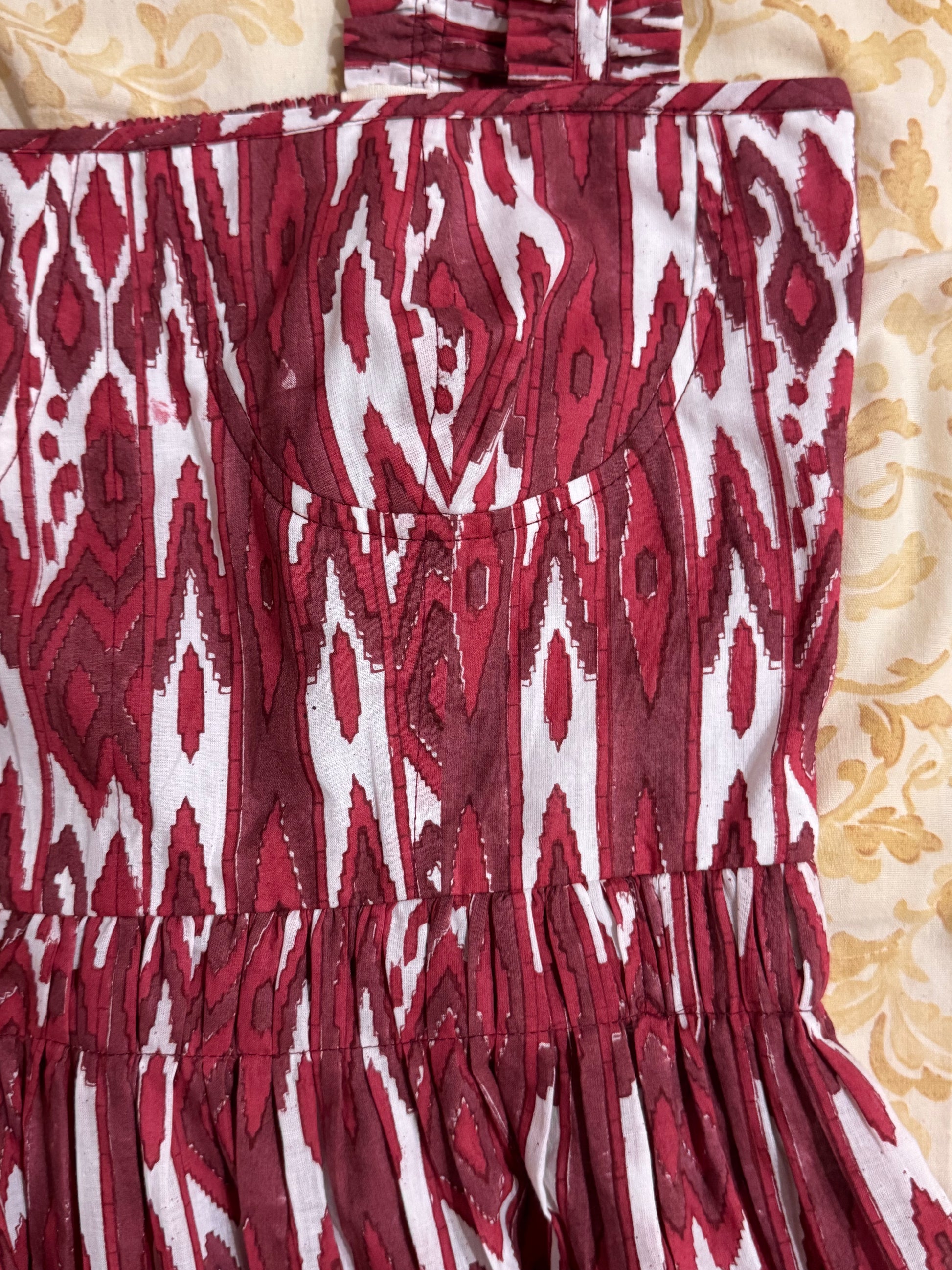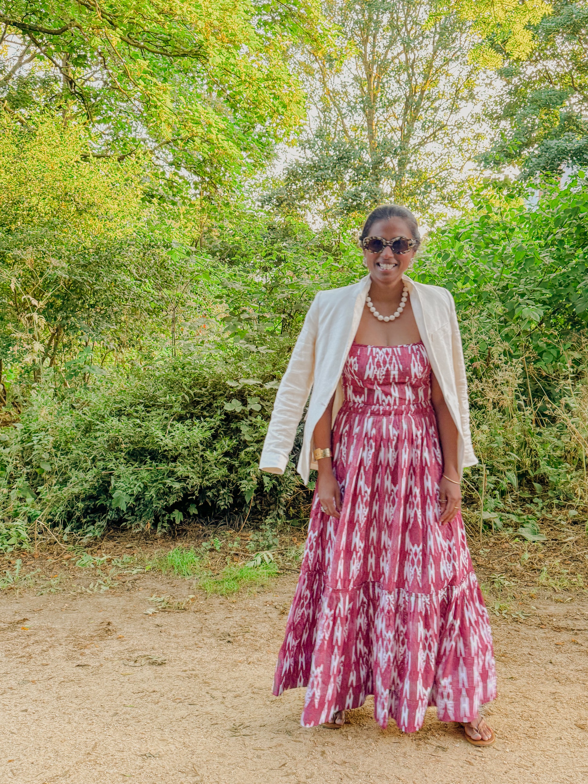The timeless GEORGINA dress is destined to be a classic for years to come. Its upper body boasts a snug fit, courtesy of the smocking in the back, forming a corset-like silhouette that is remarkably comfortable to wear. The wide square neckline is flattering to all and creates a beautiful frame. Transitioning seamlessly, the top of the dress tapers at our narrow point and then gracefully unfolds into a long, skirted bottom. Pockets are thoughtfully incorporated for both style and practicality.