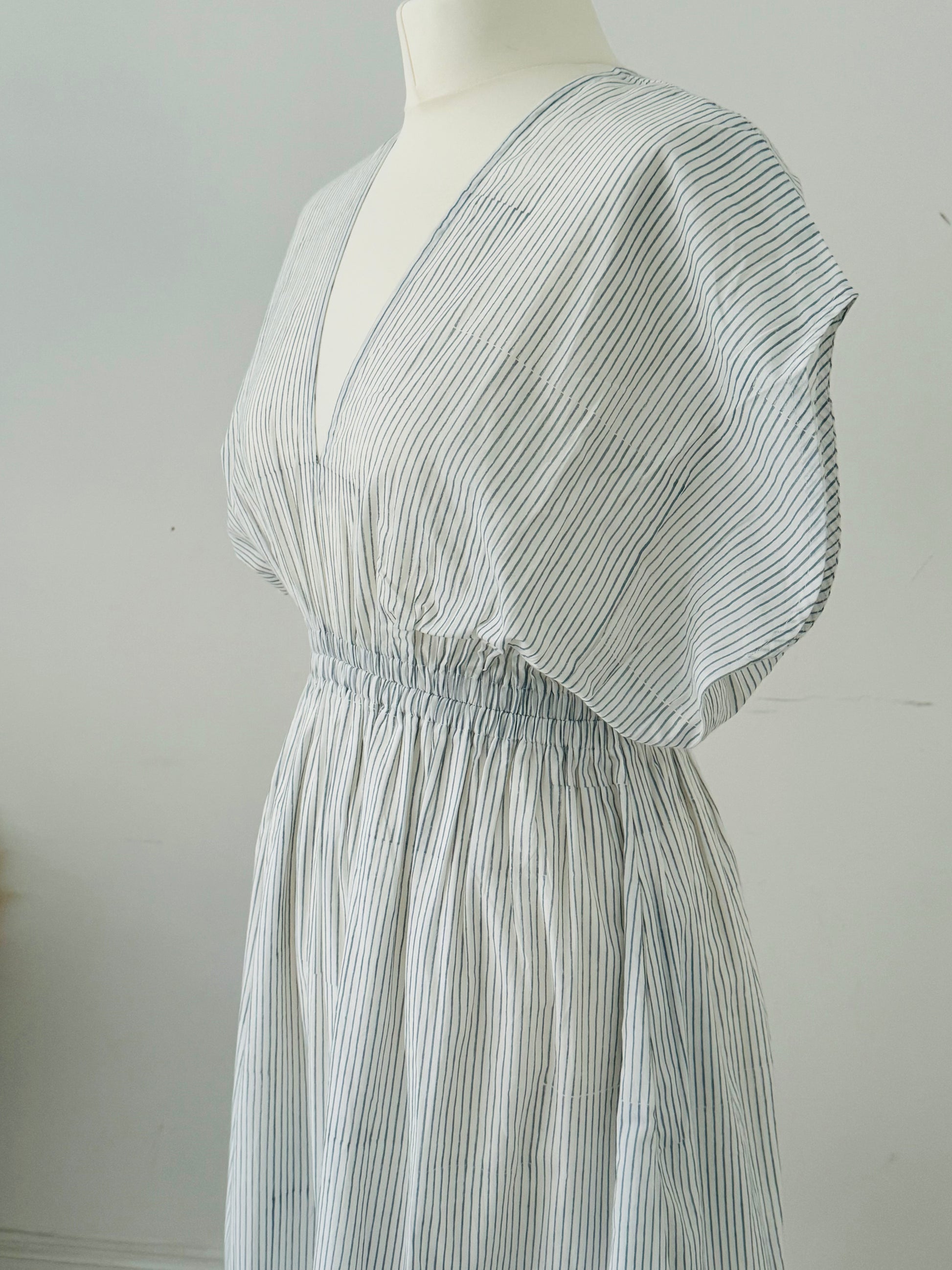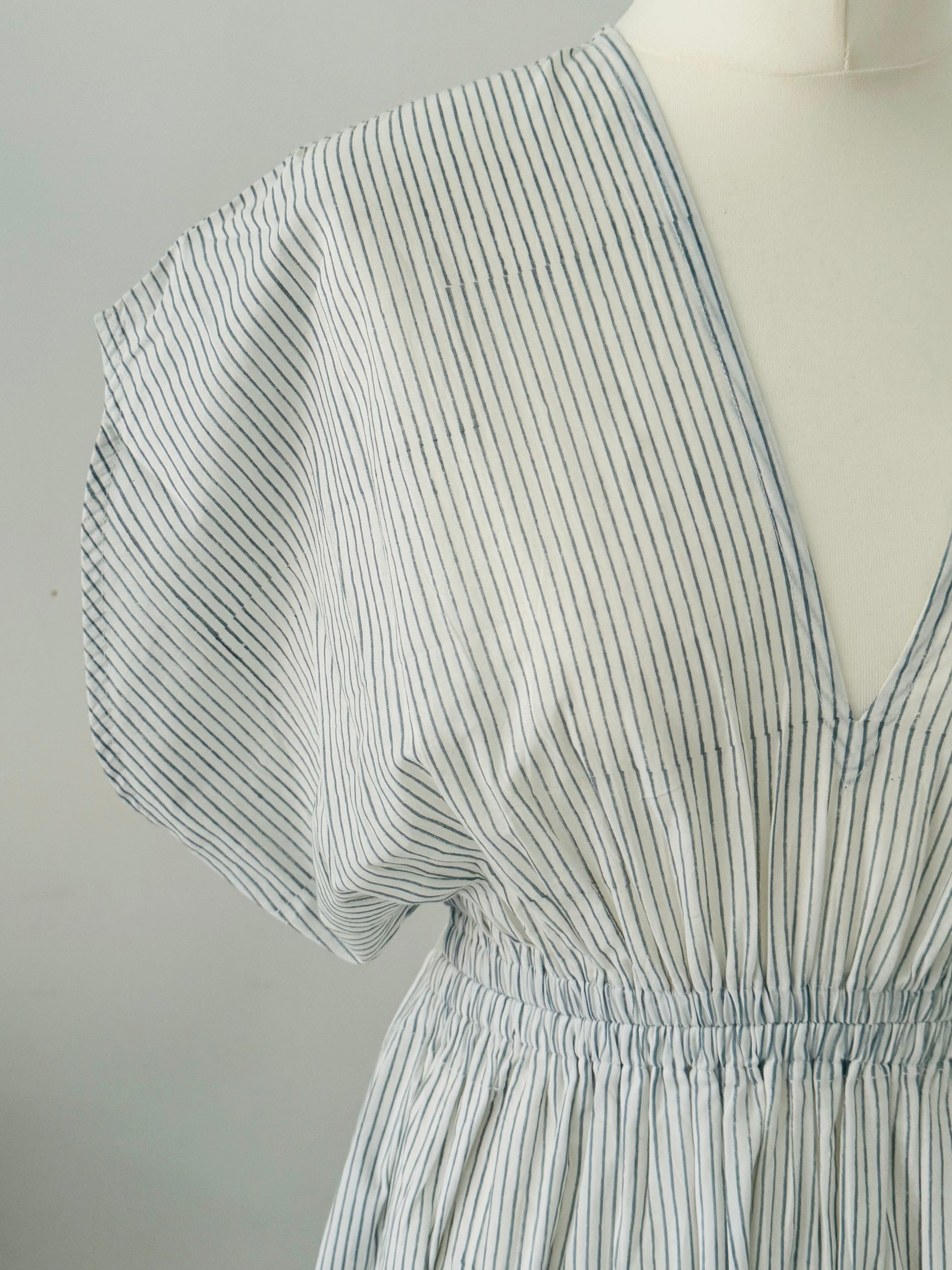 The Nura Dress is a versatile and effortless summer essential. Featuring a classic kaftan design with a V neck and elasticized waist, this dress is both comfortable and stylish. The addition of pockets and a lined interior adds functionality to the fashionable blue pinstripe pattern. Perfect for everyday wear.