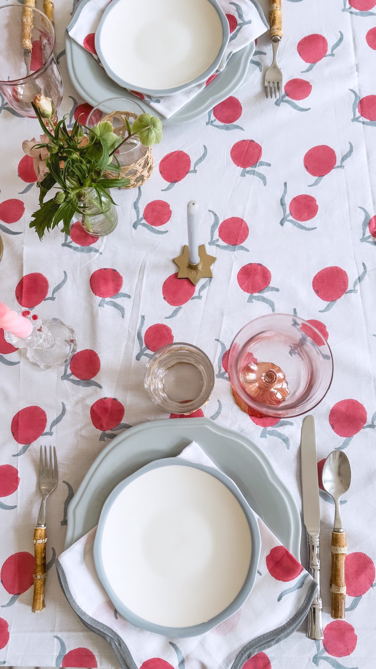 This Summer Fruit tablecloth draws inspiration from the vibrant citrus trees that adorn the roads of Rome. The bold pink fruit introduces a whimsical and lively vibe to any summertime table setting. Enhance the look with vivid pink blooms or a splash of Blue flowers.