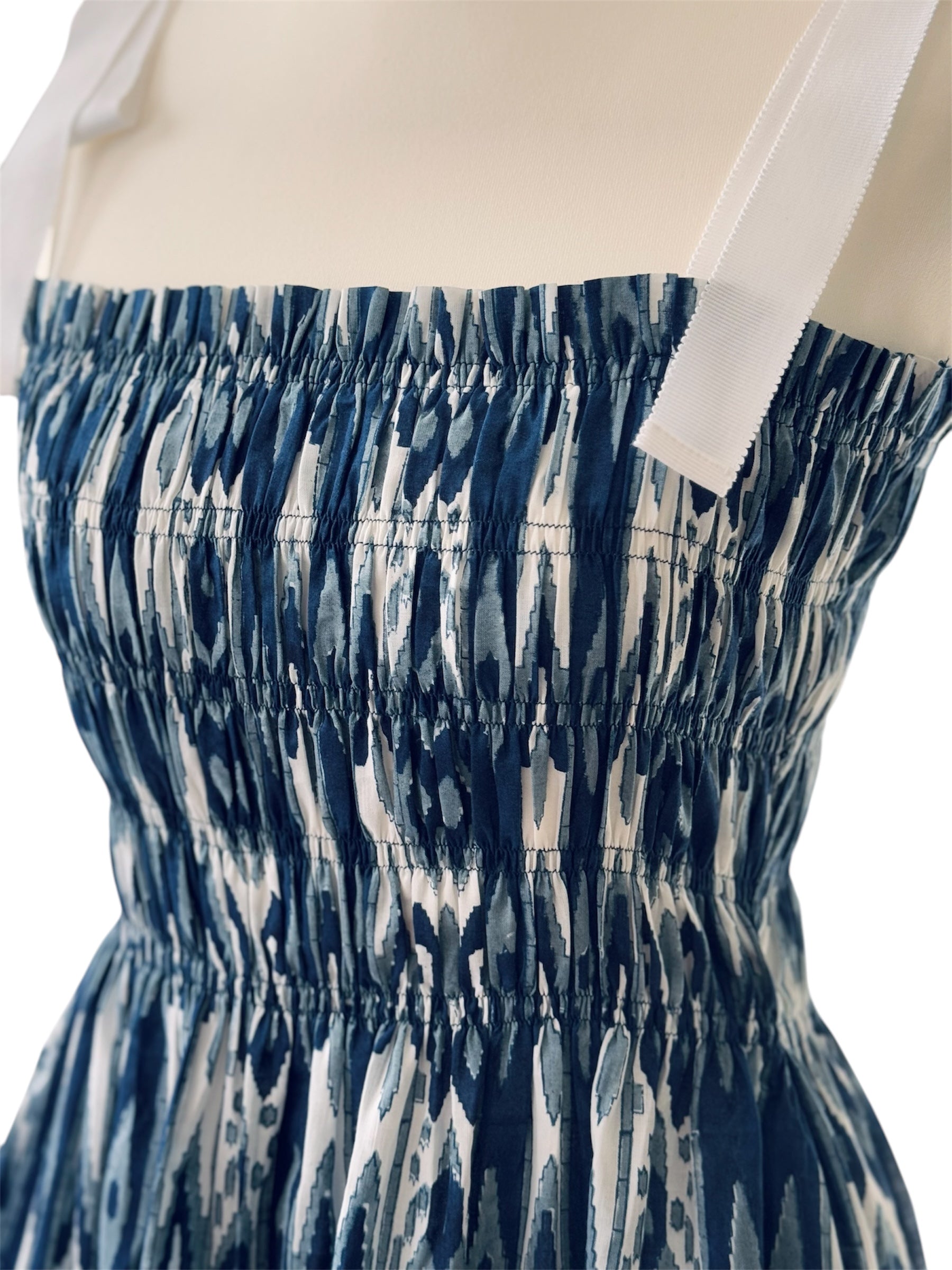 With a smocked bodice for ease and a flowing skirt that moves with you, it's finished with delicate shoulder ties crafted from premium French petersham ribbon.